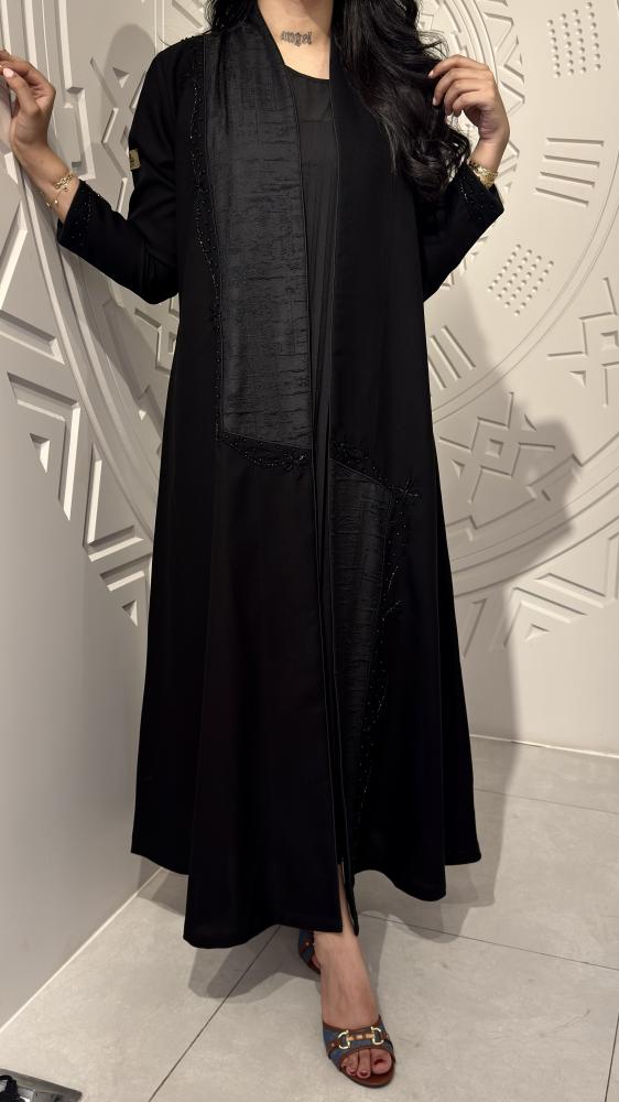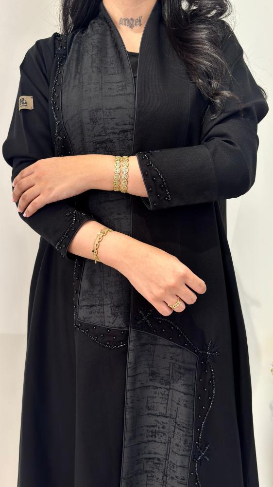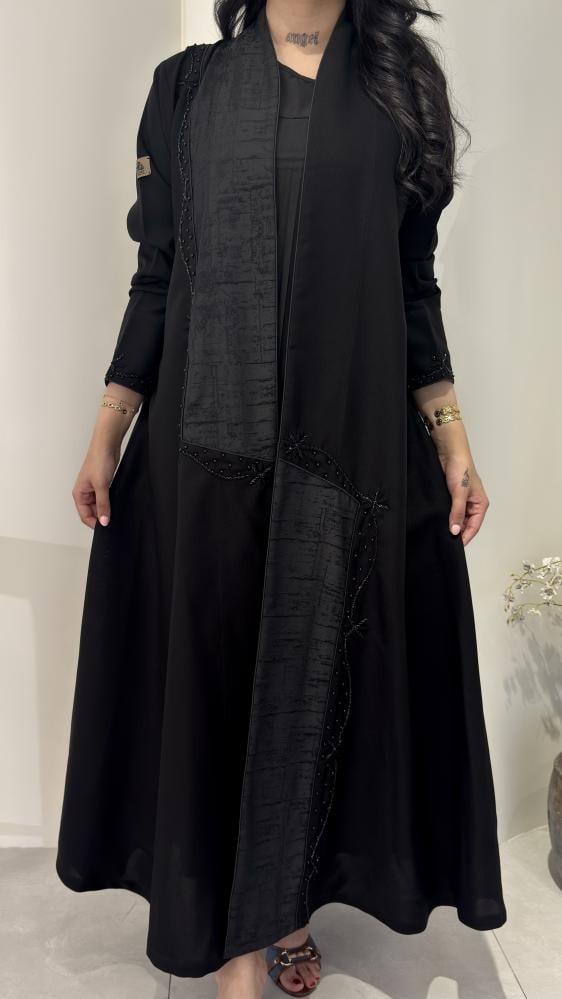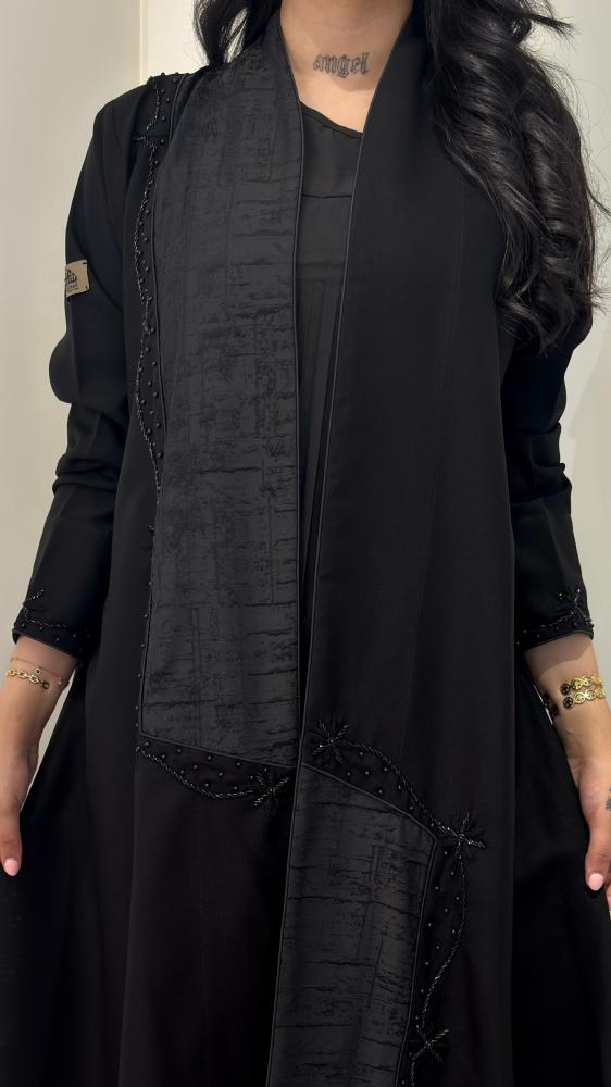 أحدث عباية صيفيه تتميز بقصة نصف كلوش الأنيقة صممت بستايل راقي وانيق بتدخيلات قماش الكتان مع جاكار أسود مزين بشك يدوي على الأمام من الأعلى والأسفل التي تضفي على من ترتديها إحساساً بالفخامة والتميز.