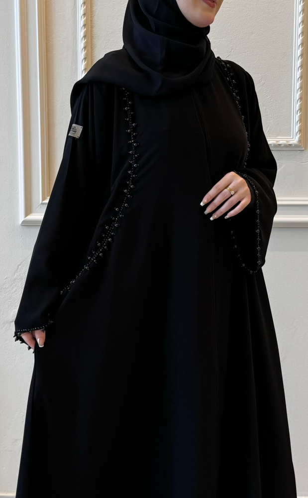 عباية سوداء بجيوب جانبية مع شك أسود من الأمام والخلف . تألقي بمظهر عملي وأنيق بقصة مختلفة وفريدة من شغف ، العباية مصممة بشكل يمنحك الجمال والأناقة بتفاصيلها المميزة،