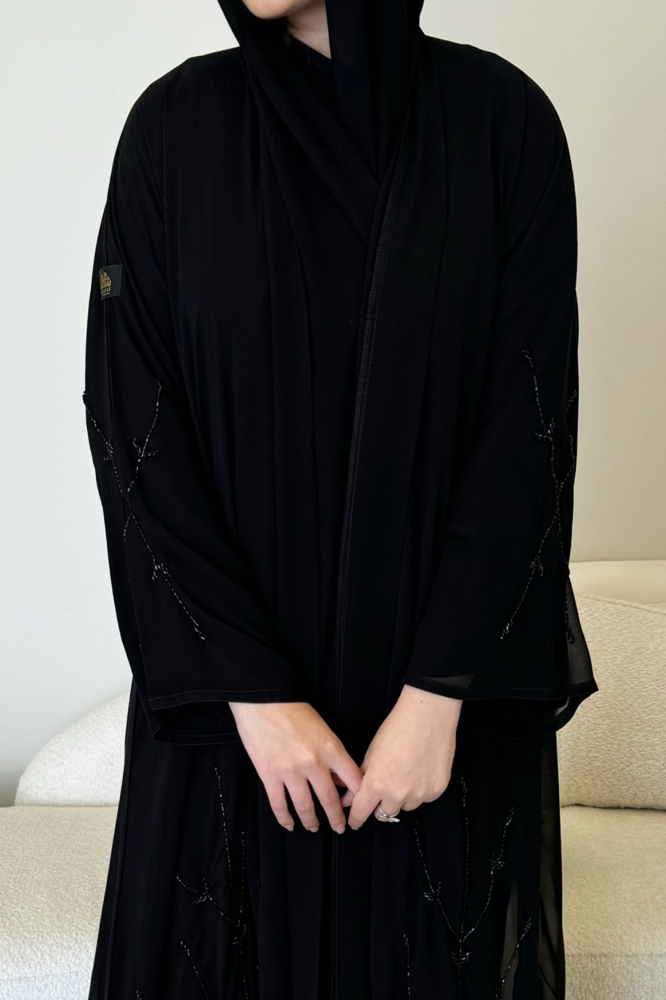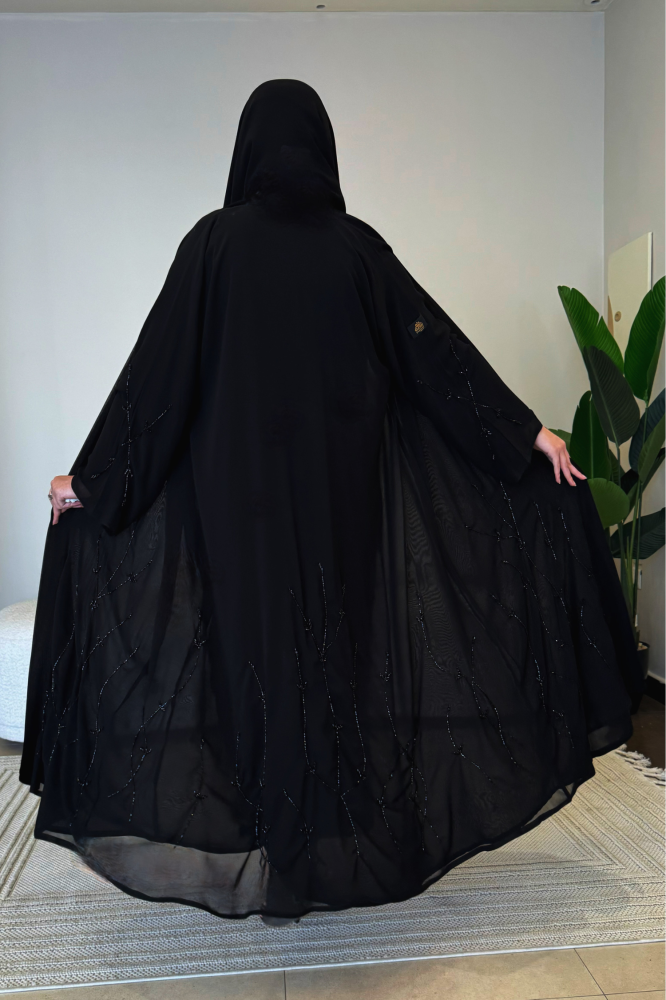 - عباية فاخرة بقماش الشيفون ،- مزينة يشك أسود على الأكمام والأسفل تعطيها مظهر انثوي.