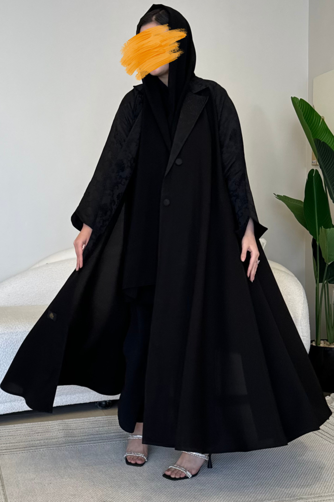 عبايتنا منسوجة من قماش كتان أسود فاخر بقصة دبل كلوش مميزة بياقة رسمية من الأمام مع اضافة قماش مشجر أسود أنيق تميزك بكل مناسباتك