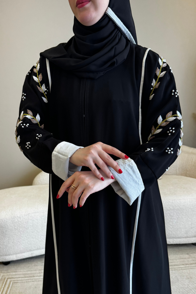 عباية نصف كلوش أنيقة مزينة بشك فضي على الأكمام .