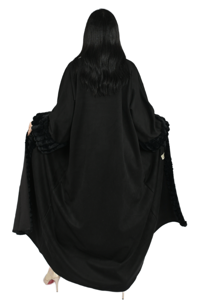 عباية شتوية من قماش الشامواه الاسود الفخم، مضاف عليها من الامام والاكمام فرو مقلم أسود لتجعل إطلالتك دافئة وناعمة.