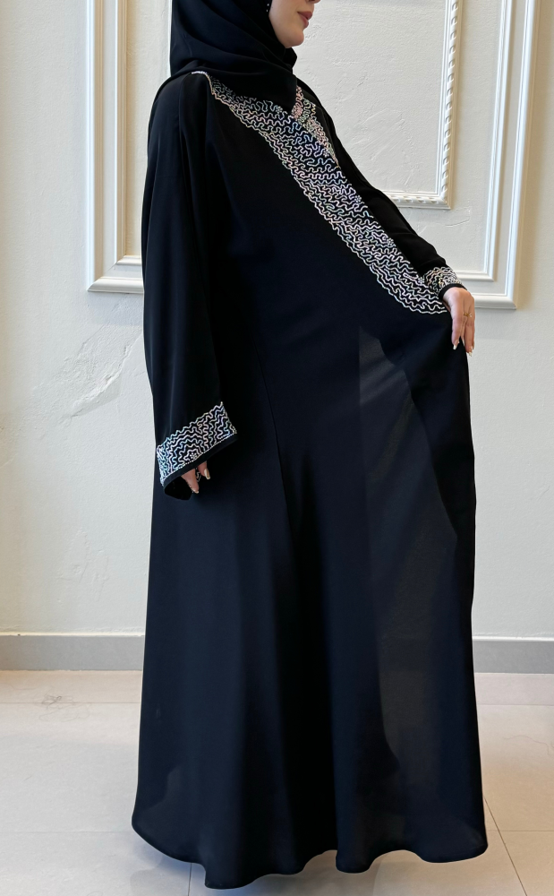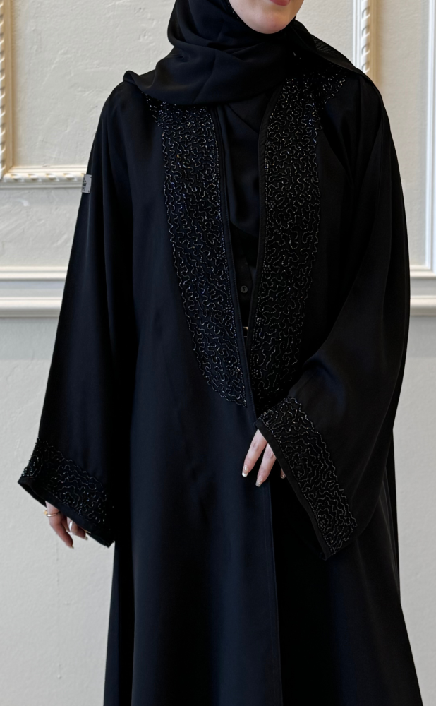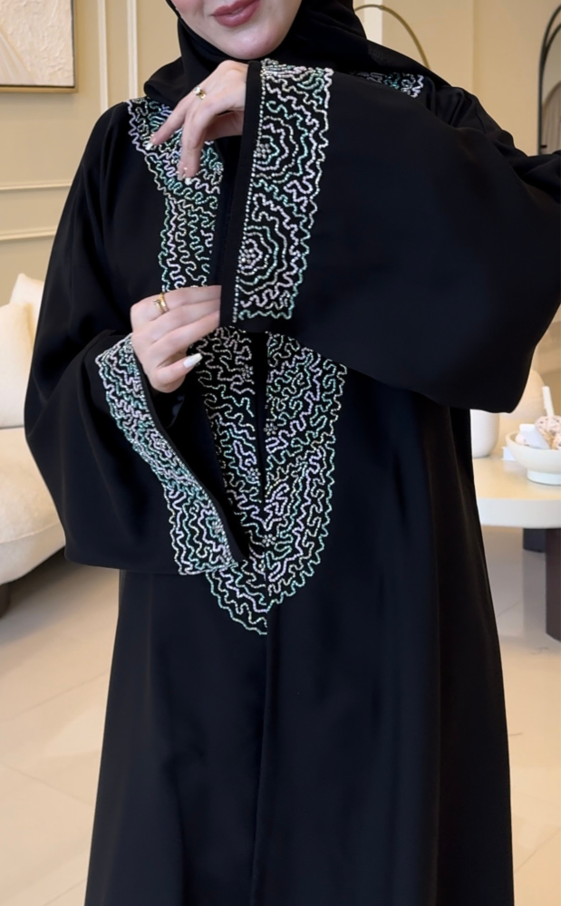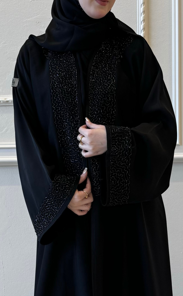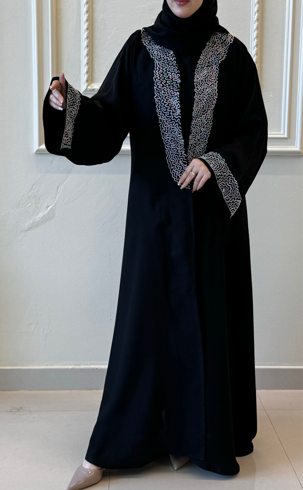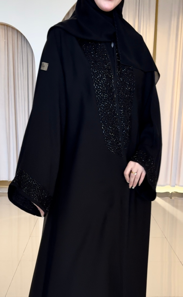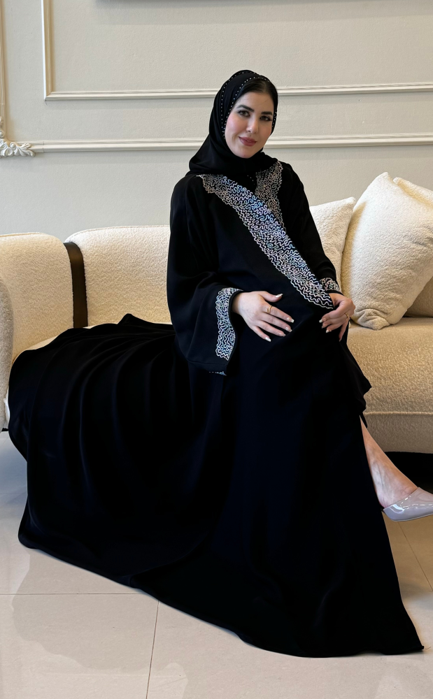 - نسیج فاخر : عبایتنا مطرزة و مصنوعة من قماش انترنت كوري اسود الذي یتمیز بكونه عملي ، وله القدرة على الاحتفاظ بلونه وشكله مما يجعله رائع ومناسب جداً للعبایات