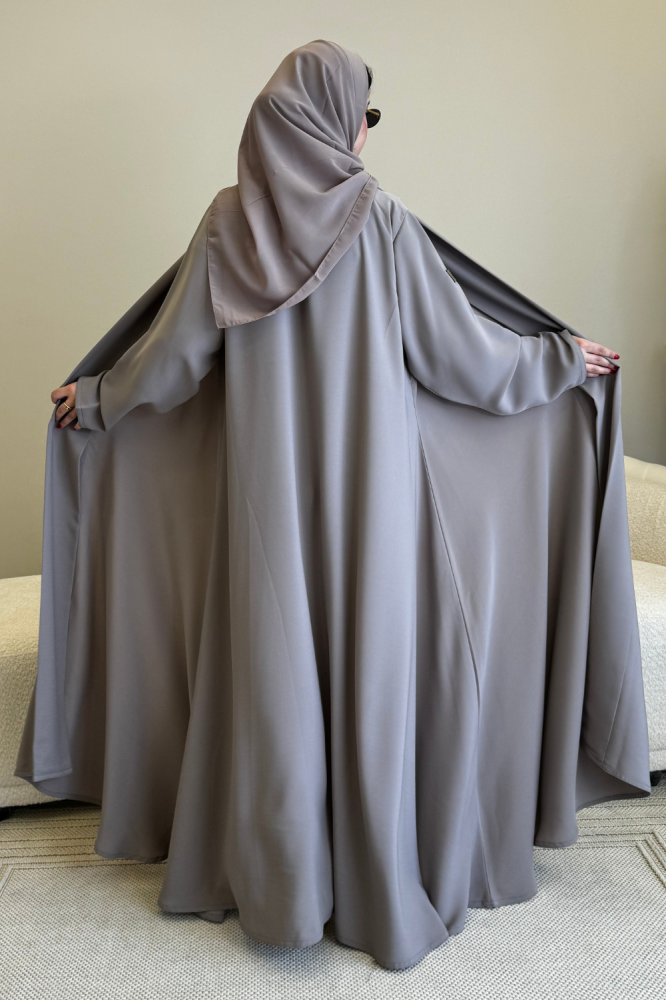 عبايه لون رمادي فاتح بقصة كلوش فاخره تميزها ياقة دبل من الأمام .