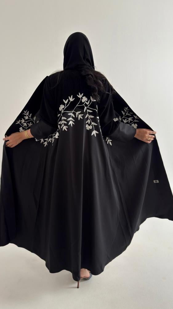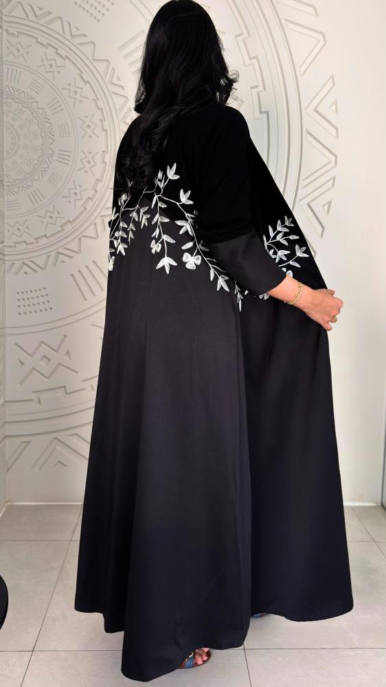 تألقي مع عباية بقصة نصف كلوش بتصميم أنيق بتدخيلات قماش الكريب الملكي الاسود من الاعلى مع قماش تفته من الاسفل يزينها تطريز أبيض أنيق في الوسط تميزك في جميع مناسباتك .