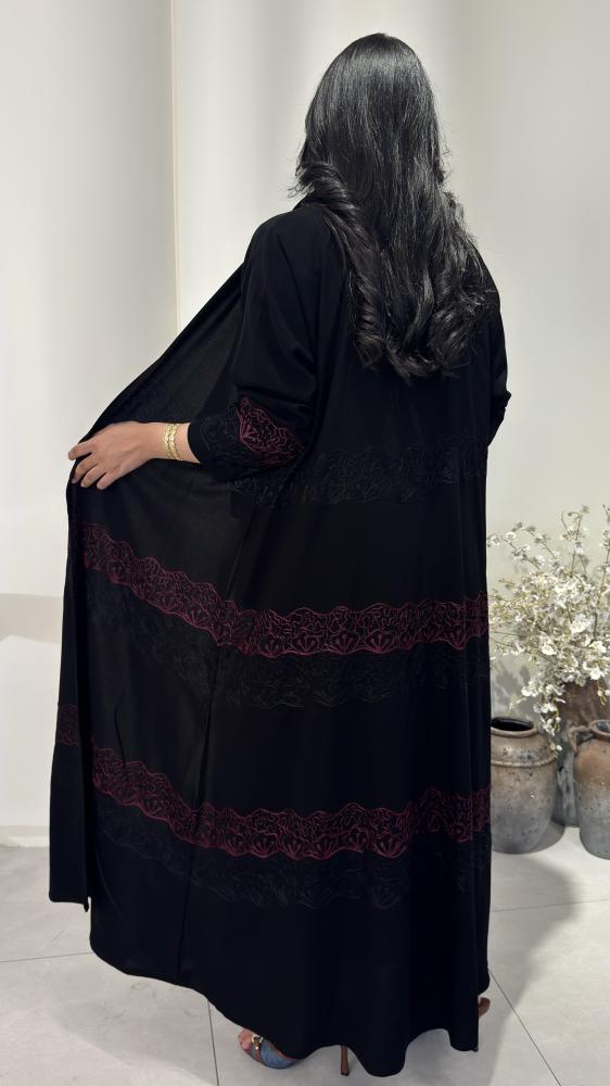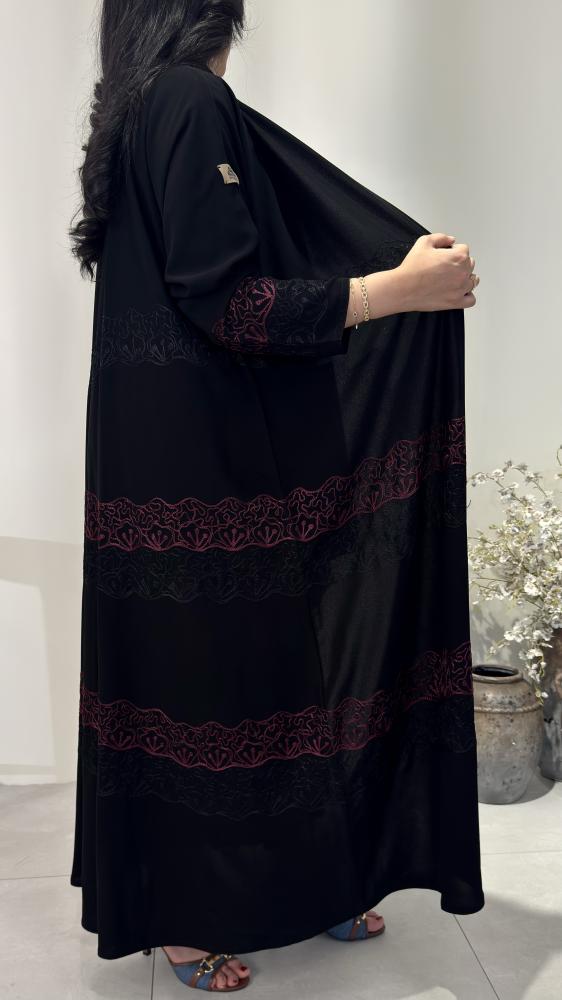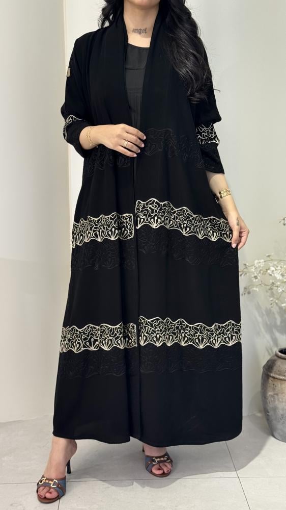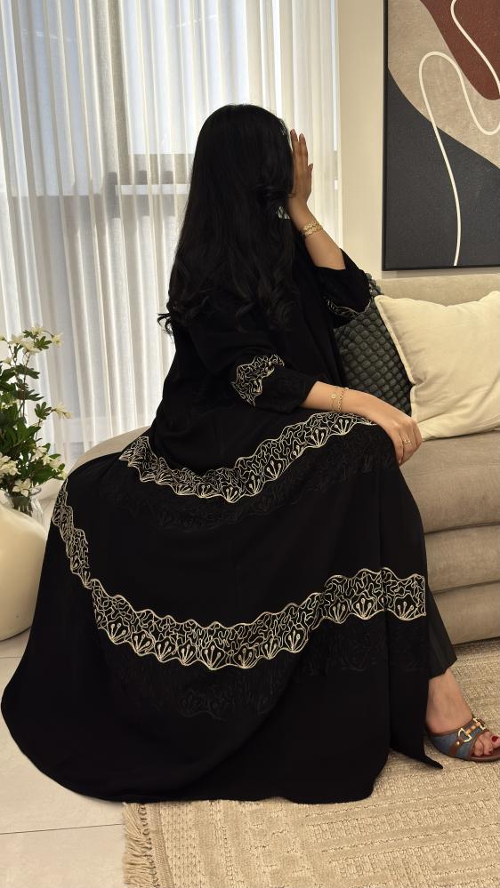 تأتي بتصميم فني من تطريز يدوي ممتد بنمط أفقي مطرز يعطي العباية طابعًا ملكيًا.