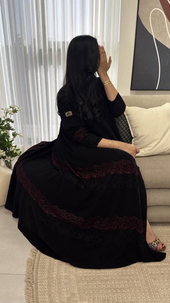 تأتي بلونين العنابي والبيج ممزوج بتطريز أسود متعوب عليه ويعطيك شعور بالفخامة