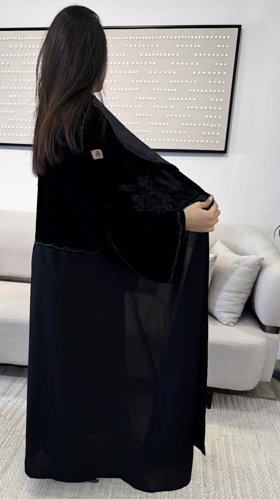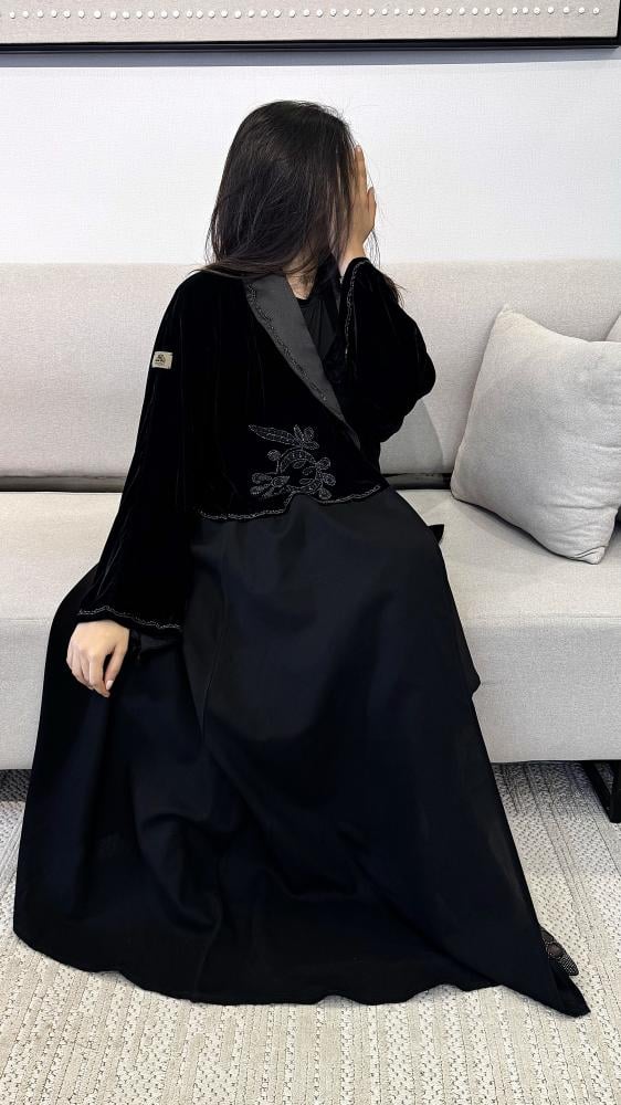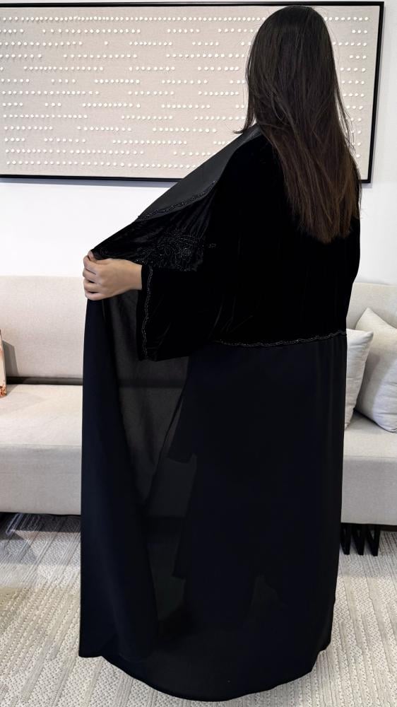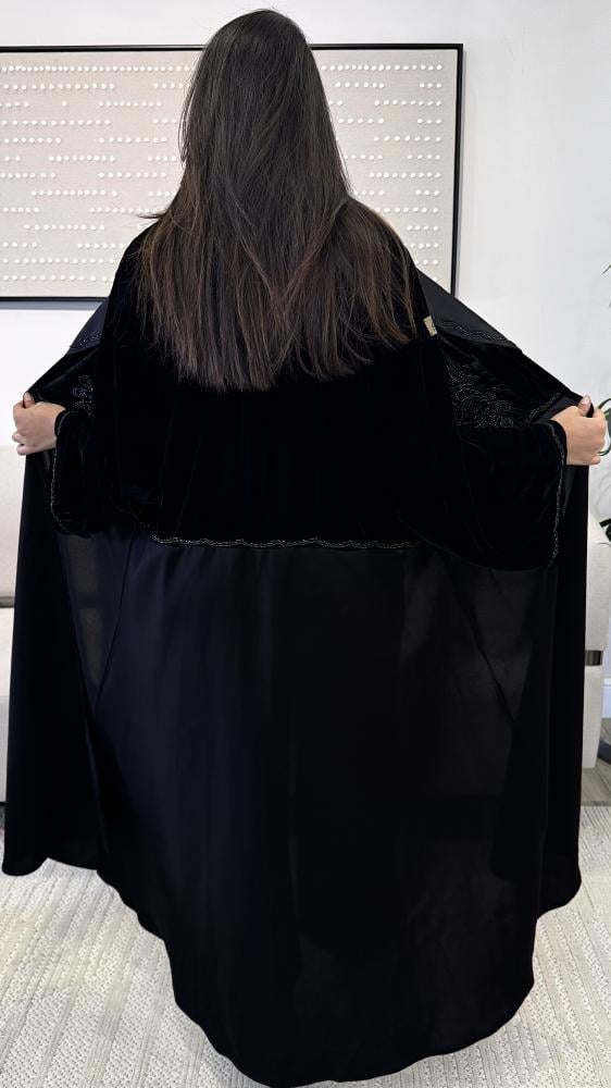 عباية فاخرة مزينة بشك أسود من قماش المخمل مع كتان