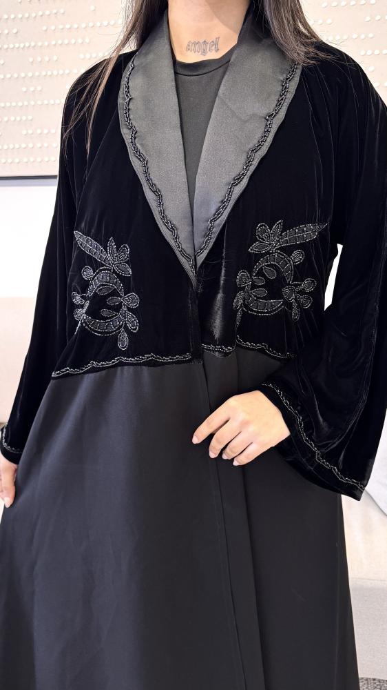 تأتي العباية بقصتها من المخمل في أعلى العباية مع قماش كتان أسود من الاسفل. يزينها شك أسود تمنحك إطلالة رسمية بلمسة من الفخامة .