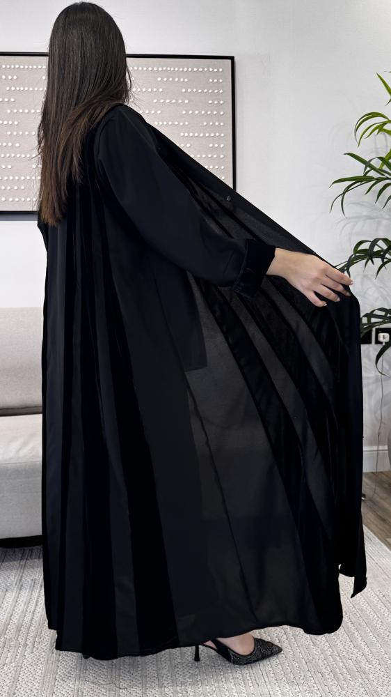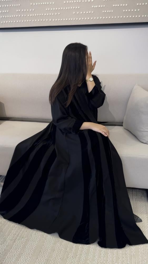 - عباية كلوش كتان مع تدخيلات طولية مخمل أسود منحها قدراً كبيراً من الأناقة والجاذبية.