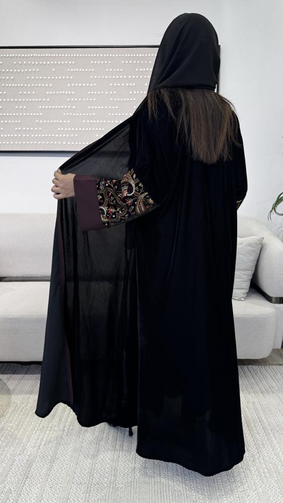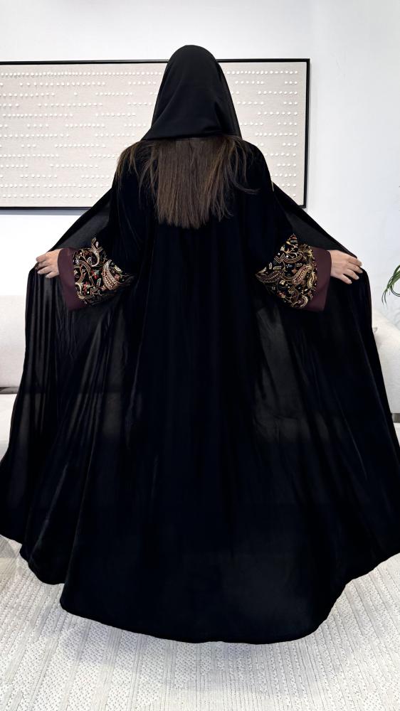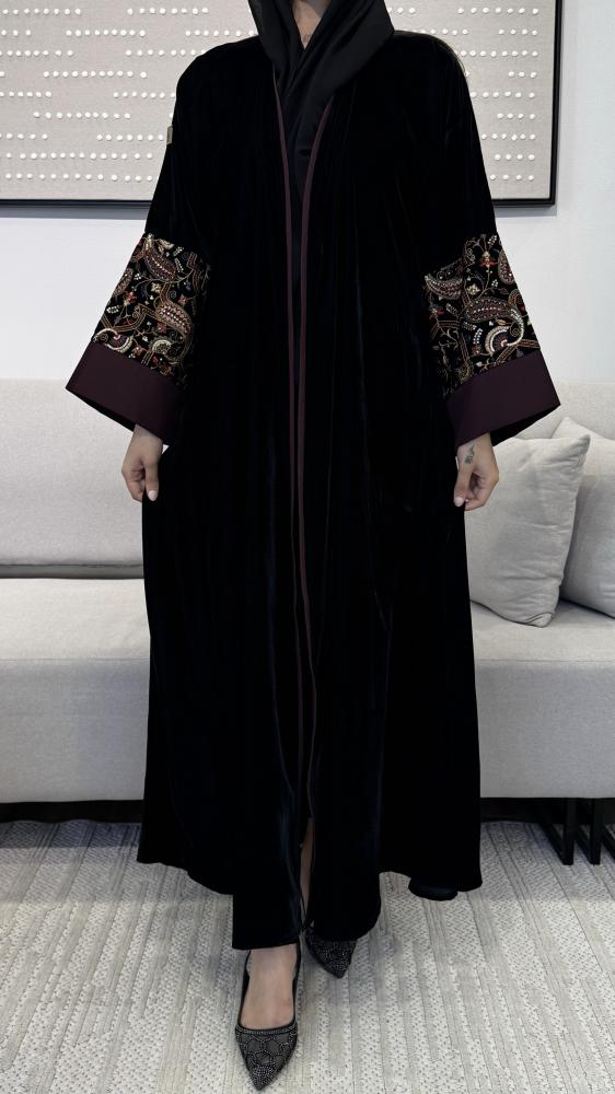 وفرنا لكِ أحدث الإطلالات الفخمة من قماش المخمل الأسود المزين بالتطريز الهندي الأنيق على الكم.